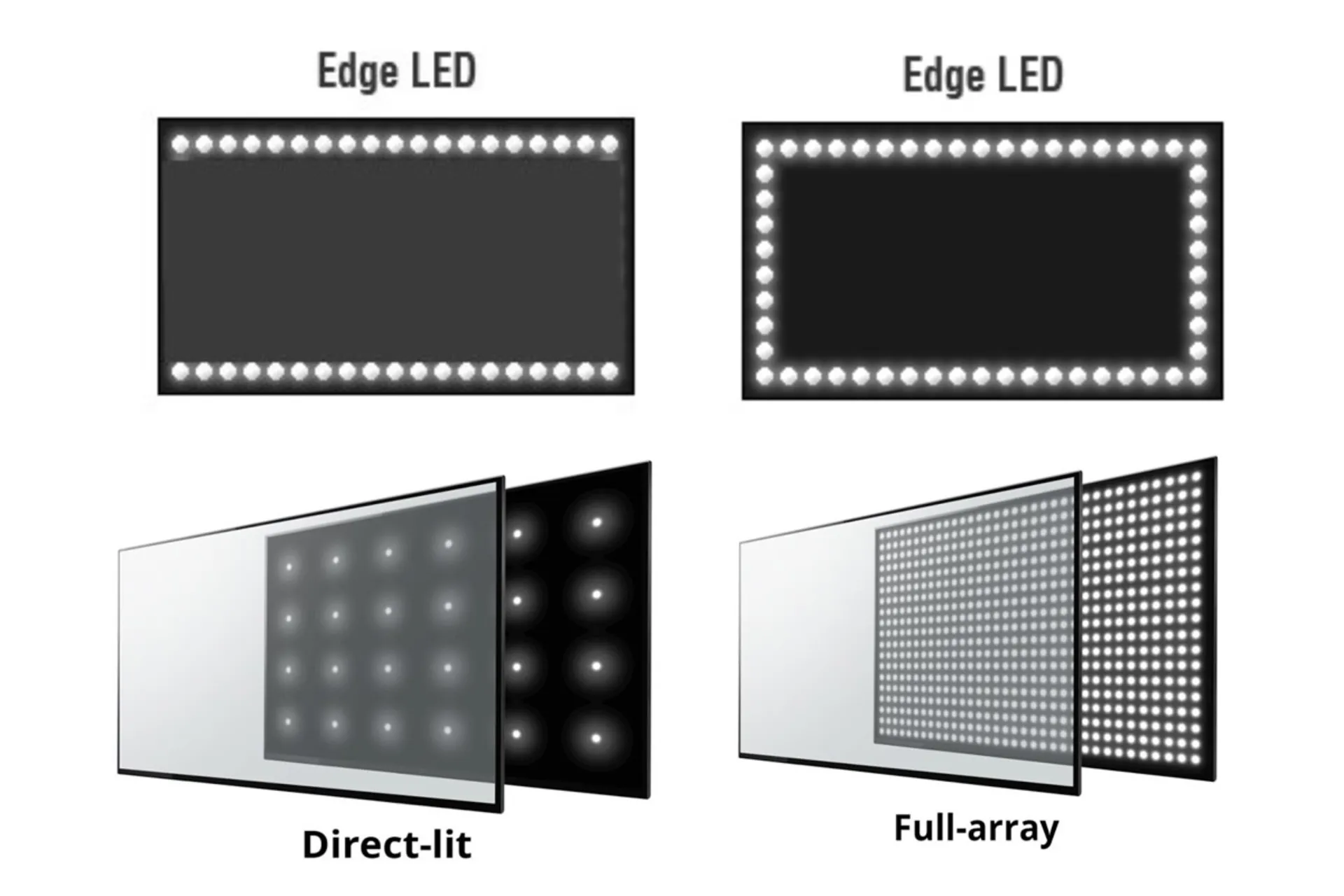 در مدل Edge-lit، LEDها در لبههای پنل قرار دارند و نور از طریق صفحات نوری پخش میشود. در حالی که در مدل Direct-lit، LEDها بهصورت شبکهای در پشت کل صفحه چیده شدهاند که باعث افزایش کنتراست و کنترل دقیقتر نور میشود.